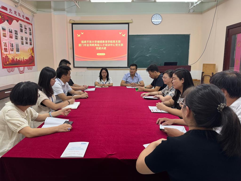 活动首站,党支部与合作办学点厦门金海峡高级人才培训中心党支部开展党建共建座谈。双方围绕党建与业务融合、教学管理、服务提升等方面进行了深入交流。双方一致认为,要以党建为引领,共同开展党群活动,提升服务效能,把党建互促互进的政治优势转化为推动办学业务高质量发展的组织优势,努力克服当前招生办学面临的难题,构建互带互动、优势互补、共同发展的党建与办学协同新格局。